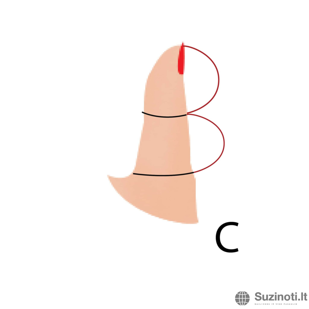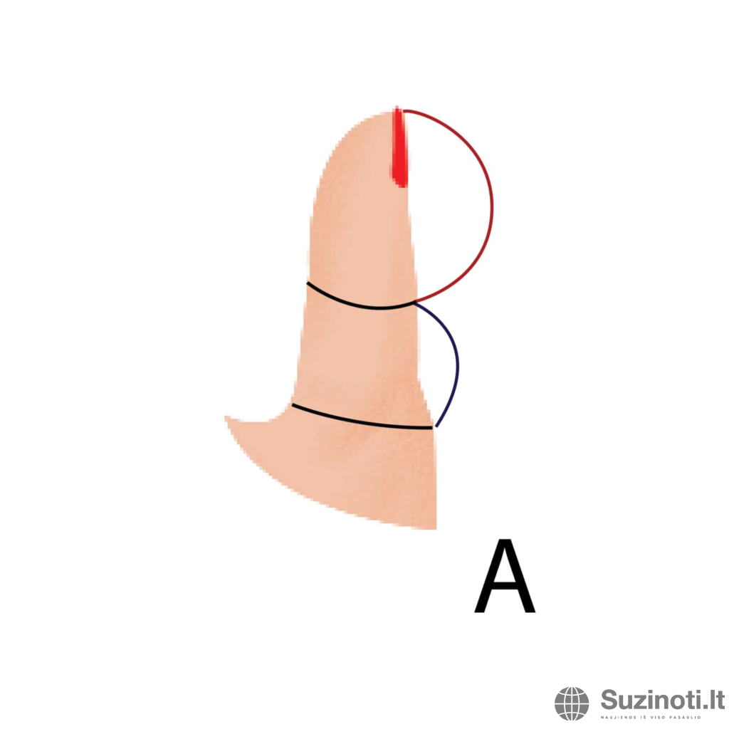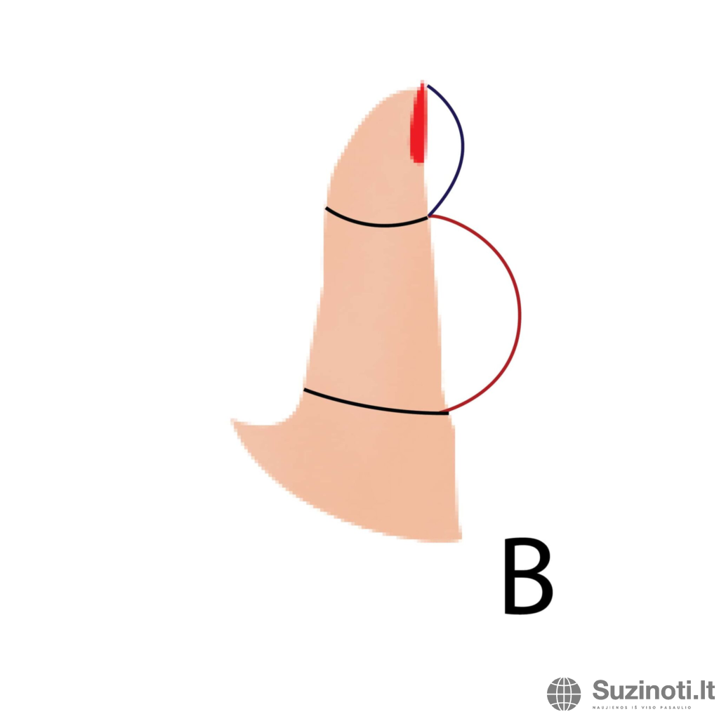 2. B tipas – didžiojo piršto apatinė dalis didesnė nei viršutinė.