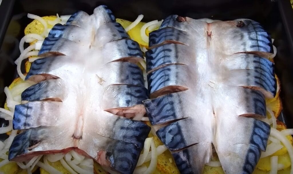 Skumbrės filė apibarstykite druska ir žuvies prieskoniais ir palikite 15-20 minučių pasimarinuoti. Nuluptas bulves supjaustykite plonais griežinėliais ir pabarstykite daržovių ir bulvių prieskoniais.