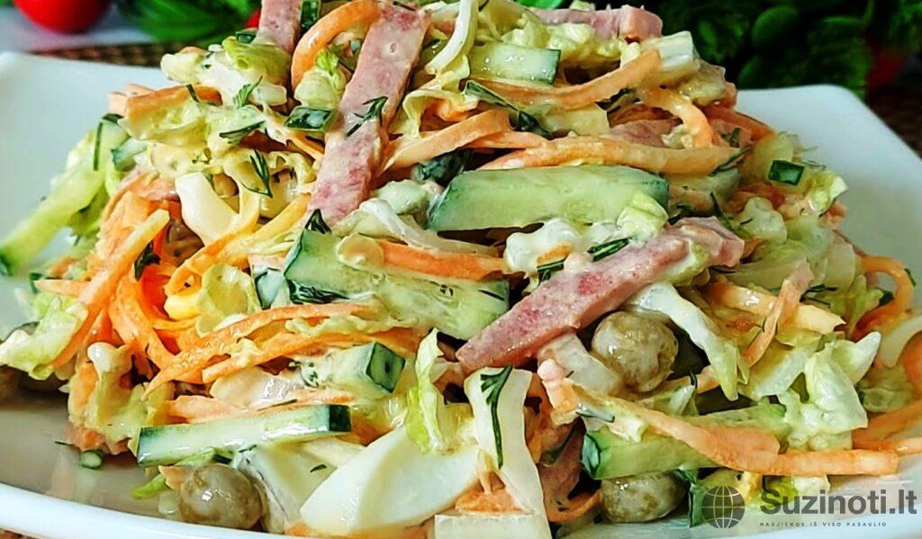 kiaušinius. Į salotinę sudėkite Pekino kopūstus, dešrelę, virtus kiaušinius ir agurką. Į salotas sudėkite korėjietiškas morkas ir žaliuosius žirnelius, susmulkinkite tuos pačius krapus