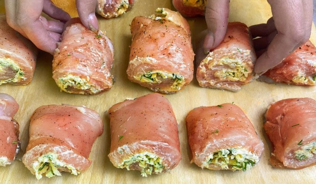 Kiekvieną kepsnį susukite į vyniotinį su įdaru viduje.