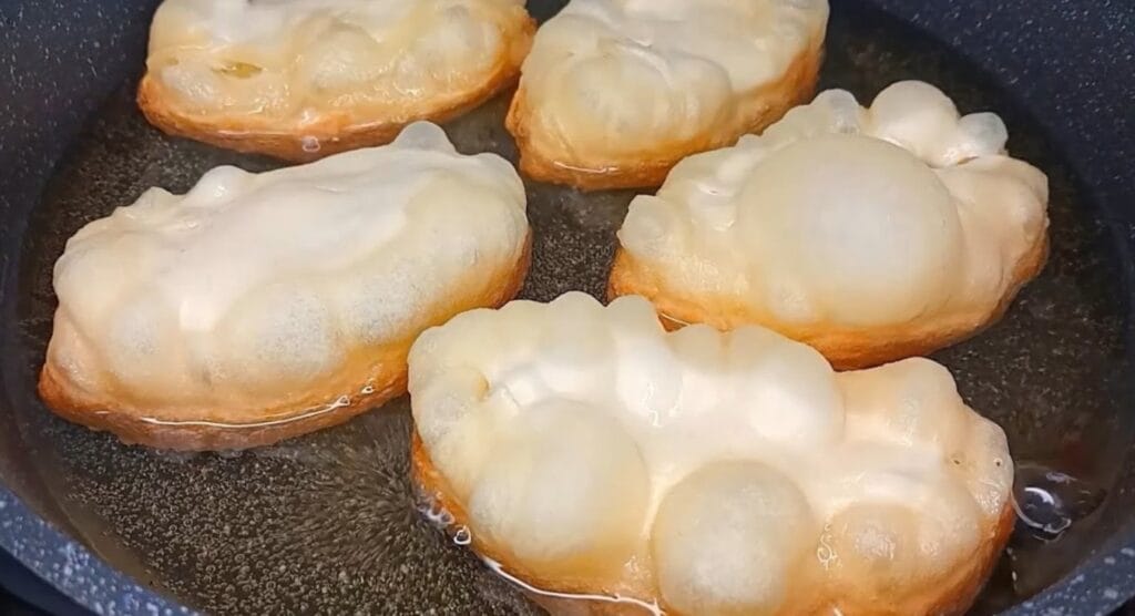 Pyragėlius apkepkite keptuvėje dideliame kiekyje augalinio aliejaus iki auksinės rudos spalvos iš abiejų pusių.