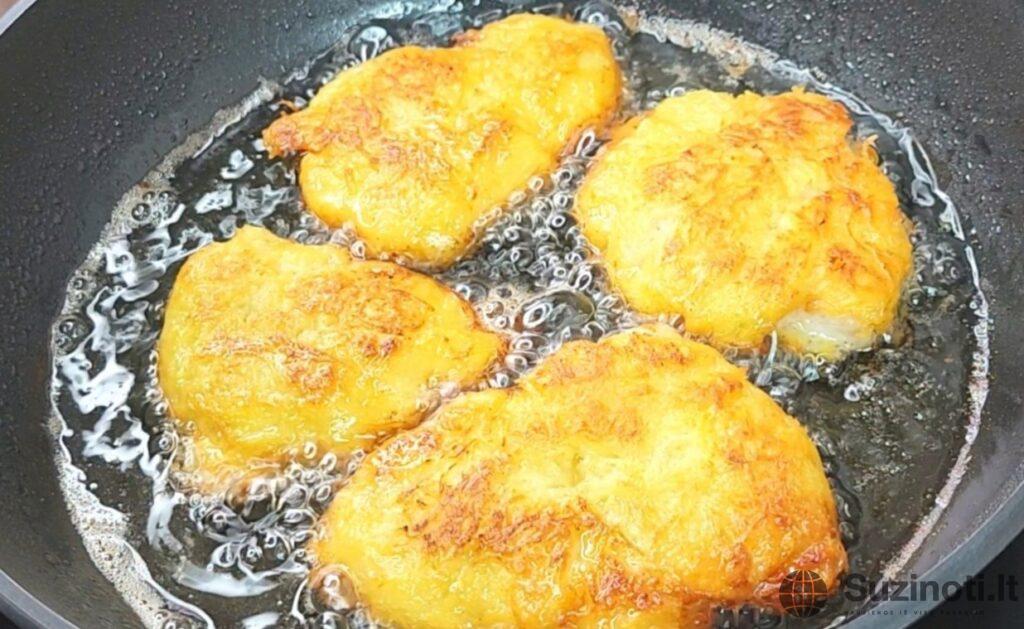 Keptuvėje augaliniame aliejuje bulvių masėje apkepkite vištienos kotletukus iš abiejų pusių, kol paruduos.