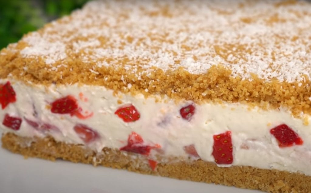 Tortas sausainių pagrindu. Tačiau dėl skonio ir gražios išvaizdos, taip pat dėl braškių aromato toks desertas gali tapti net šventinio stalo puošmena.