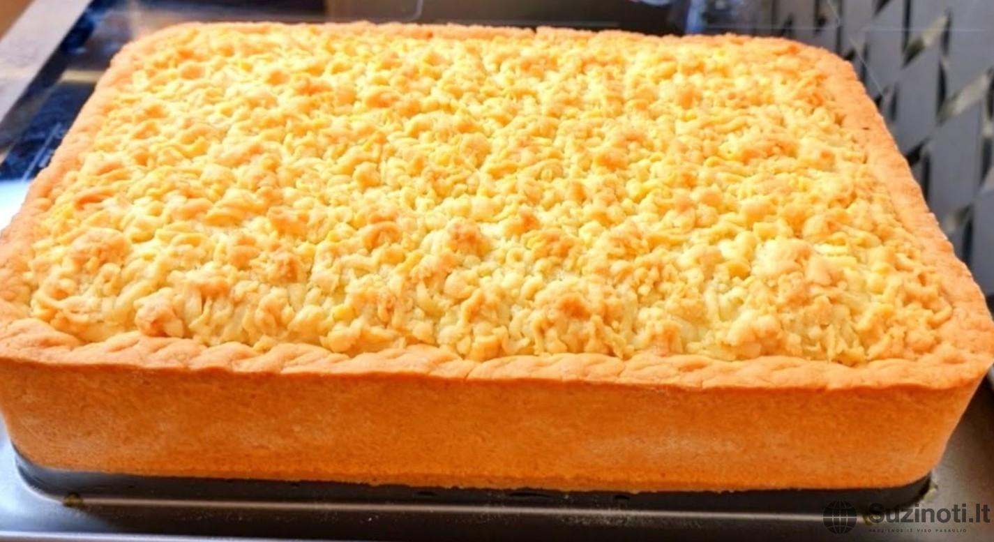 Ant viršaus užpilkite antrąją trupinių dalį, šiek tiek sutankinkite ir kelioms valandoms padėkite į šaldytuvą.