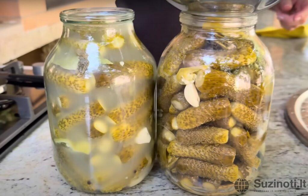 Sūrymą supilkite į puodą ir užvirinkite. Stiklainį su agurkais, neišėmę turinio, išplaukite po tekančiu vandeniu.