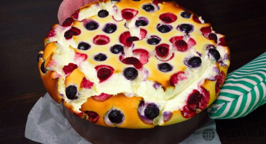 . Baltymų masę supilkite į formą, išlyginkite sluoksnį paviršiuje. Ant įdaro sudėkite vaisius arba uogas.