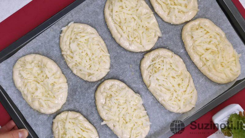 Sūrį sutarkuokite stambia tarka ir pabarstykite drožlėmis paplotėlių paviršių.