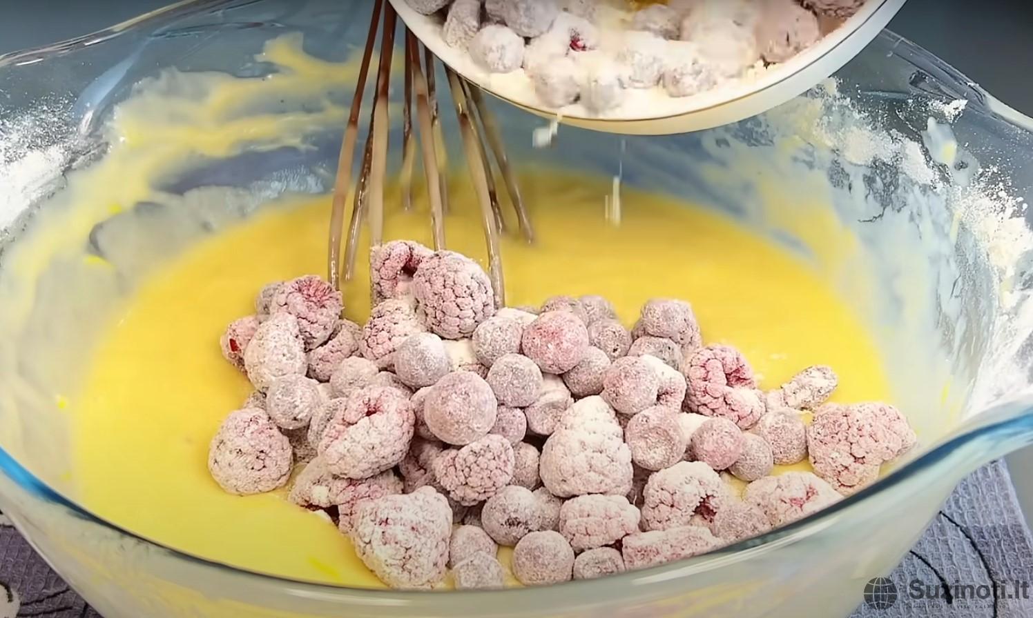 . 40 g miltų supilkite į uogas, sudėkite uogas į tešlą, dar kartą išmaišykite.