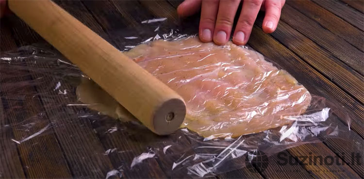 Filė lengvai pasūdykite ir papipirinkite, įtrinkite česnaku ir gerai išplakite iki ~5 mm storio. Gausite plonus mėsos sluoksnius.
