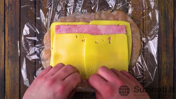 Ant kiekvieno sluoksnio dėkite 4 sūrio riekeles, ant viršaus 3 kumpio riekeles ir dar 2 sūrio riekeles.