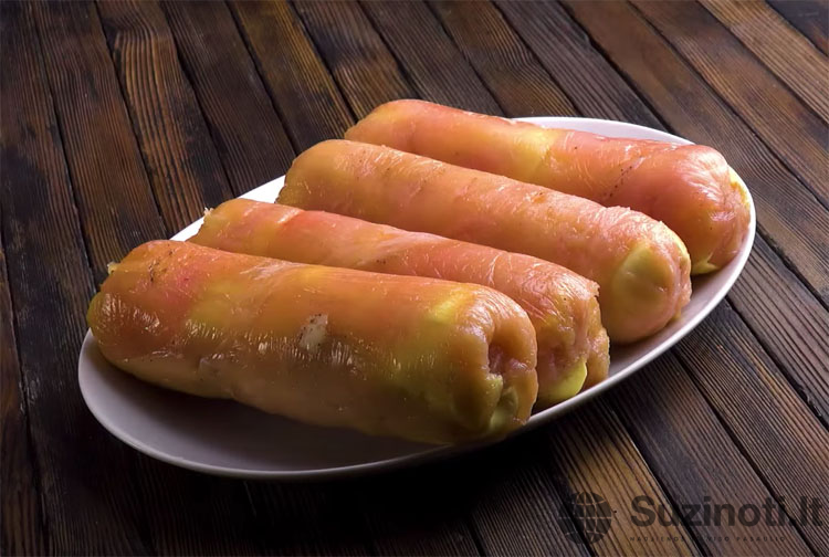 Atsargiai susukite kiekvieną vištienos gabalėlį į tvirtą ritinėlį. Apvyniokite maistine plėvele ir 1 valandai palaikykite šaldytuve, kad sustingtų forma.