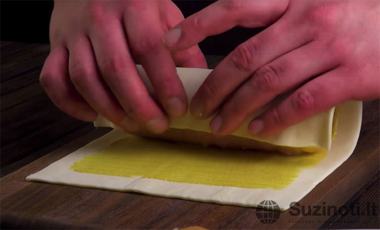 Tešlą supjaustykite stačiakampiais (maždaug 20×30 cm). Patepkite garstyčiomis, palikdami įdubimus aplink kraštus. Kiekvieną ritinėlį apvyniokite tešla, sandariai suspauskite kraštus.