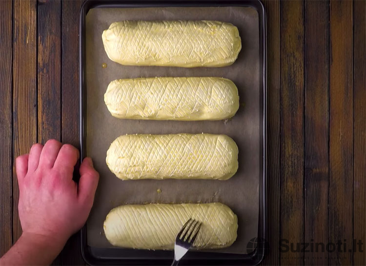 Bandeles sudėkite siūle žemyn ant kepimo popieriumi išklotos skardos. Aptepkite plaktu kiaušiniu. Šakute padarykite negilius kryžiaus formos įpjovimus, kad sukurtumėte gražų raštą.